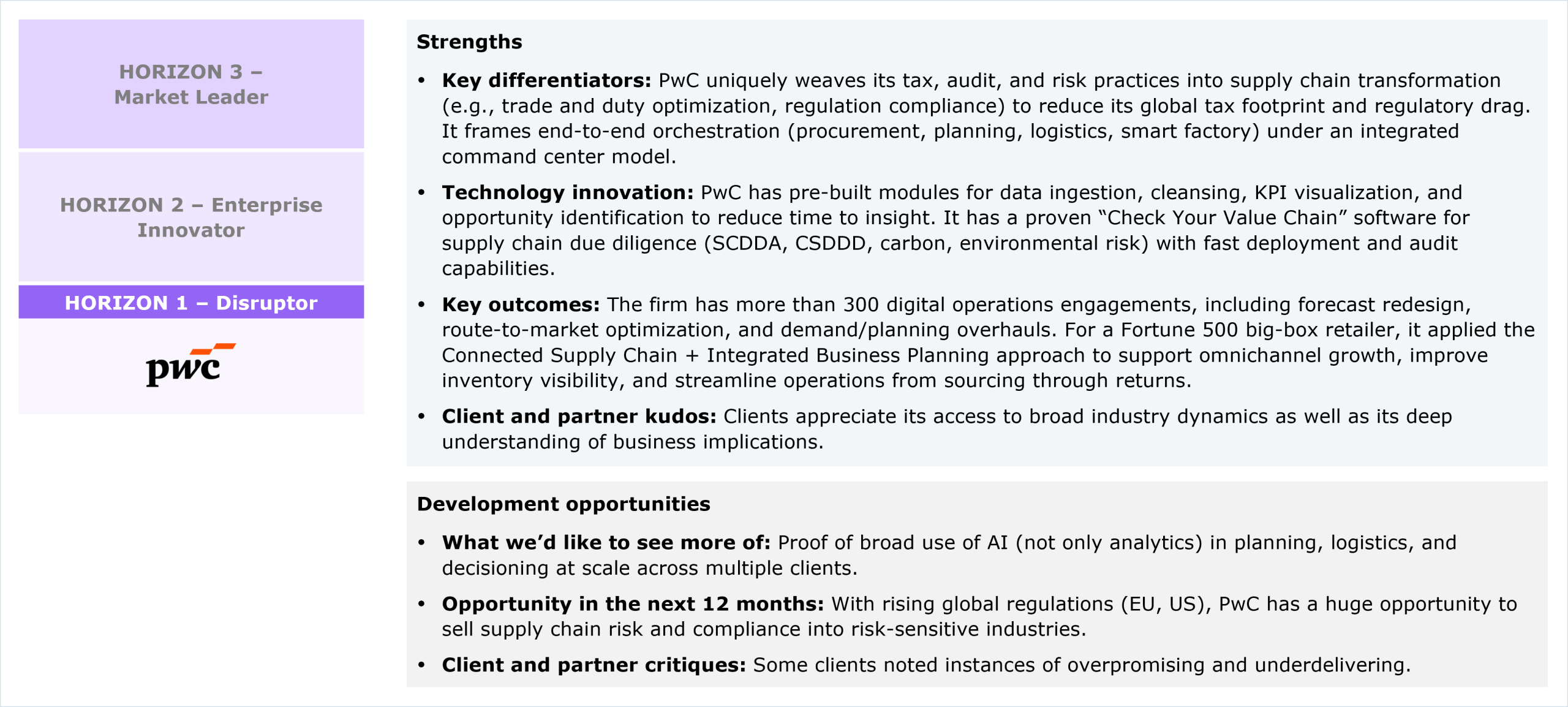 PwC’s strengths and development opportunities, as per HFS’ analysis, in intelligent supply chain services capabilities