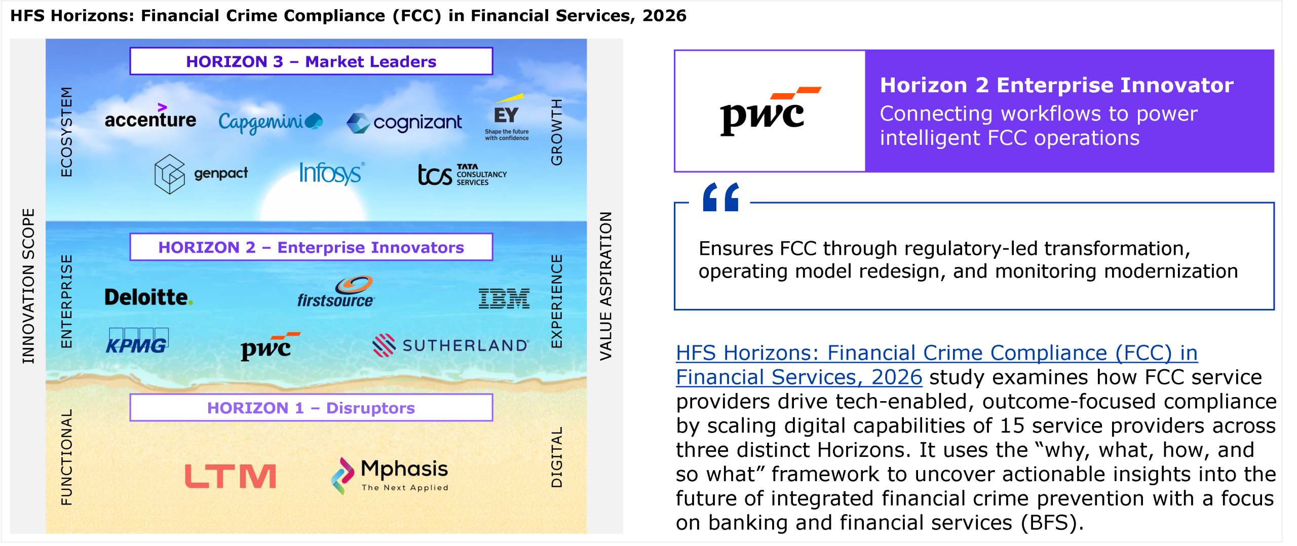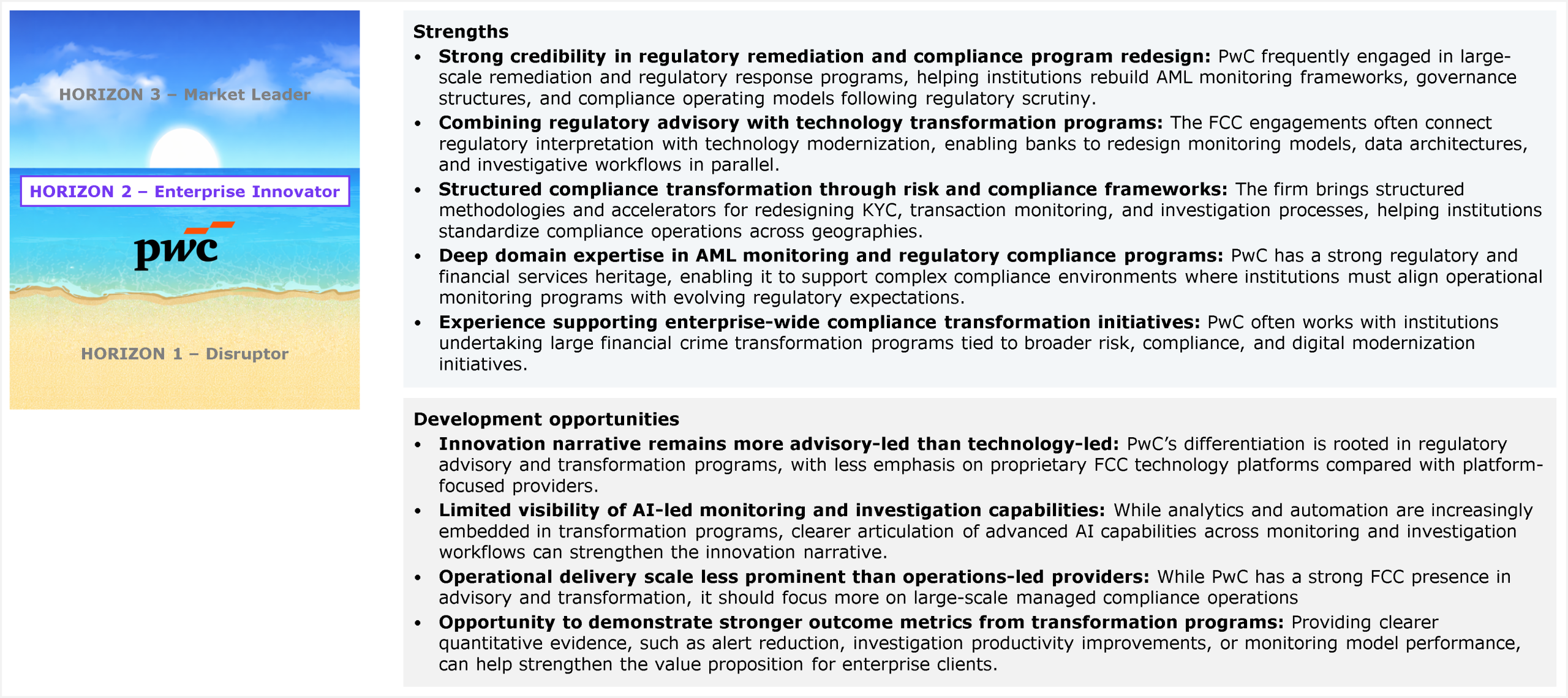 PwC’s performance in the study and HFS’ views of its strengths and development opportunities for services capabilities for financial crime compliance (FCC) in financial services
