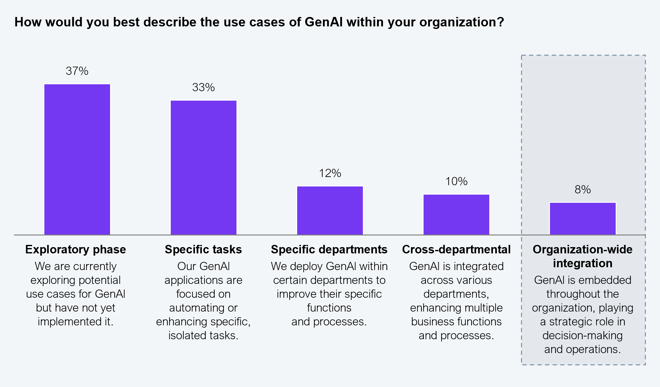 It’s time to move on from the boutique builds that led to many firms falling into the POC and pilot trap. Around 88% of enterprises remain stuck in that slow lane; many are struggling with deployment, fragmented data, limited talent, siloed business functions, and inadequate governance (HFS POV – Crack the AI maturity code). Only 8% have achieved organization-wide GenAI integration (see Exhibit 1).