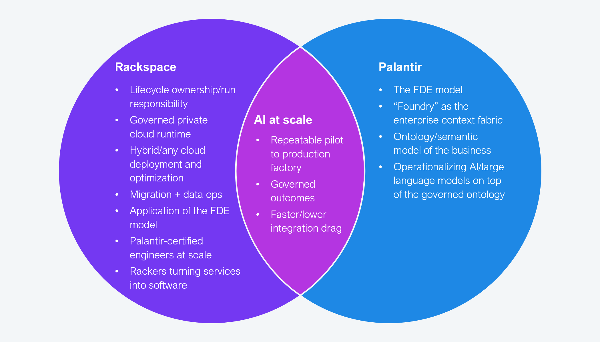 The Rackspace-Palantir proposition packages the two elements together: (i) Palantir supplies the context fabric (through their ontology and operational AI) and (ii) Rackspace offers industry-aligned implementation and systems engineering capabilities. The combination targets measurable AI value at scale beyond proofs of concept (POCs).