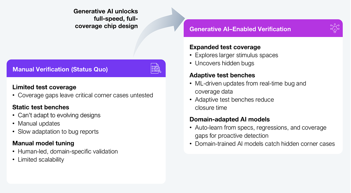 GenAI transforms verification by addressing three longstanding challenges of the manual-verification status quo: limited test coverage, static test benches, and manual model tuning. GenAI creates synthetic data and generates diverse test cases. It explores larger stimulus spaces, closes coverage gaps, and reduces silicon escape bugs (a design error caught only during manufacturing). Adaptive testbench validation uses machine learning to analyze bug reports and coverage data, update test sequences, and track closure in real-time. AI models trained on specifications, regression data, and coverage gaps can expose hidden corner cases, reduce bias, and improve functional coverage without additional manual effort.