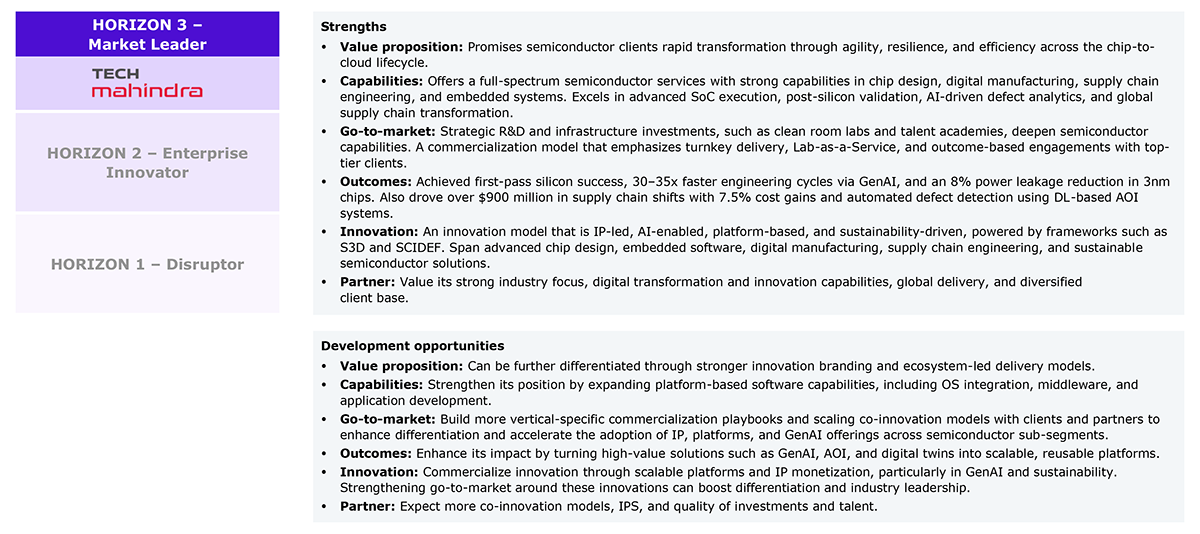 Tech Mahindra’s performance in the study and HFS’ views of its strengths and development opportunities for Semiconductor services capabilities