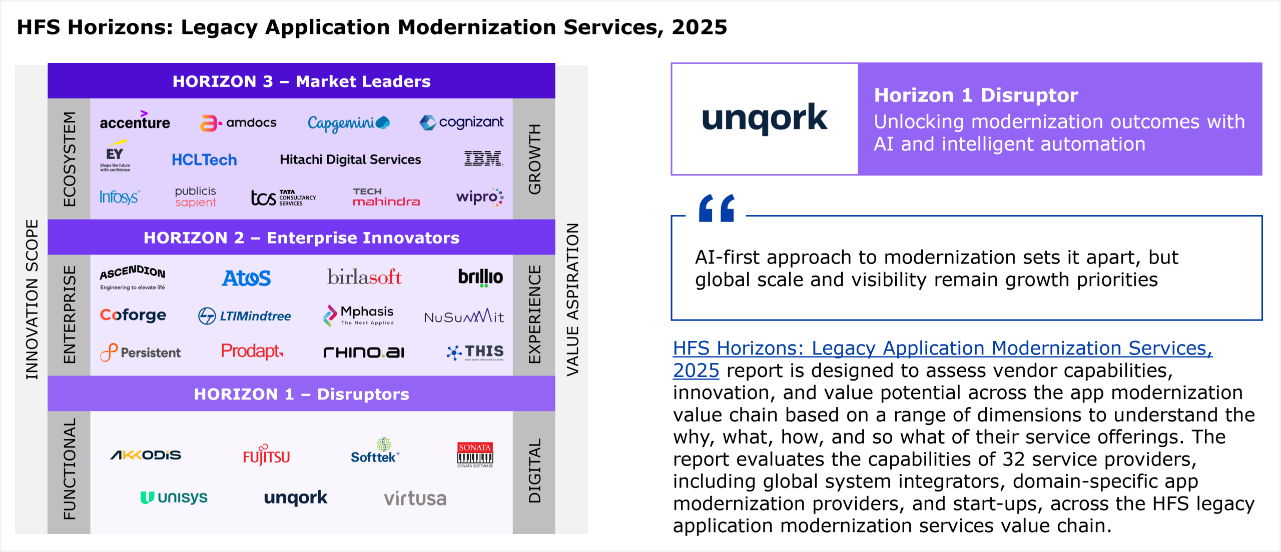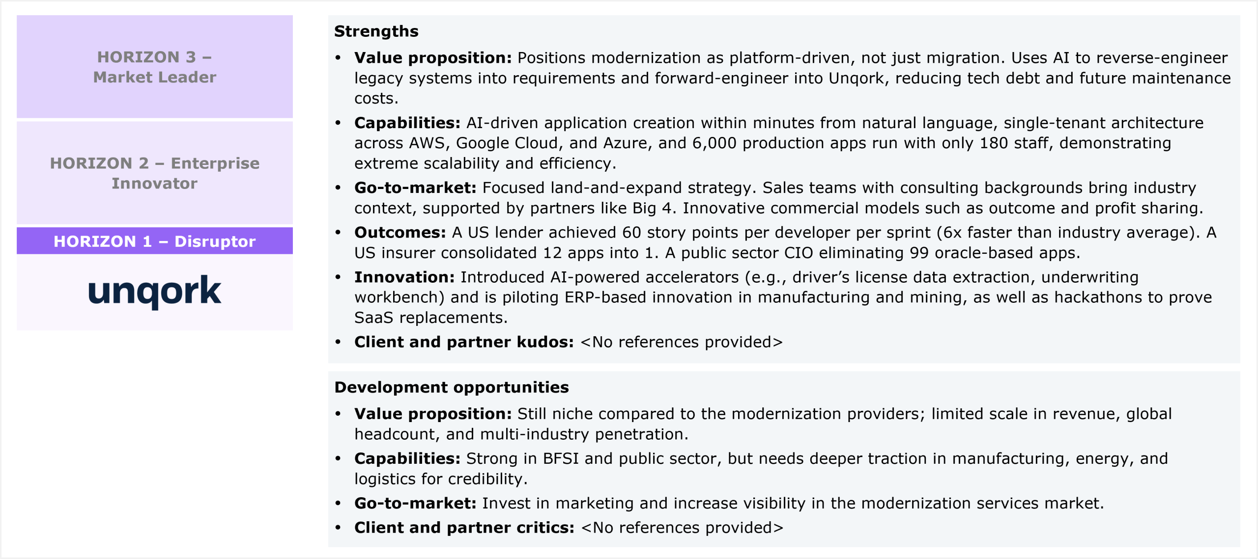 Unqork’s strengths and development opportunities, as per HFS’ analysis, in legacy application modernization services capabilities