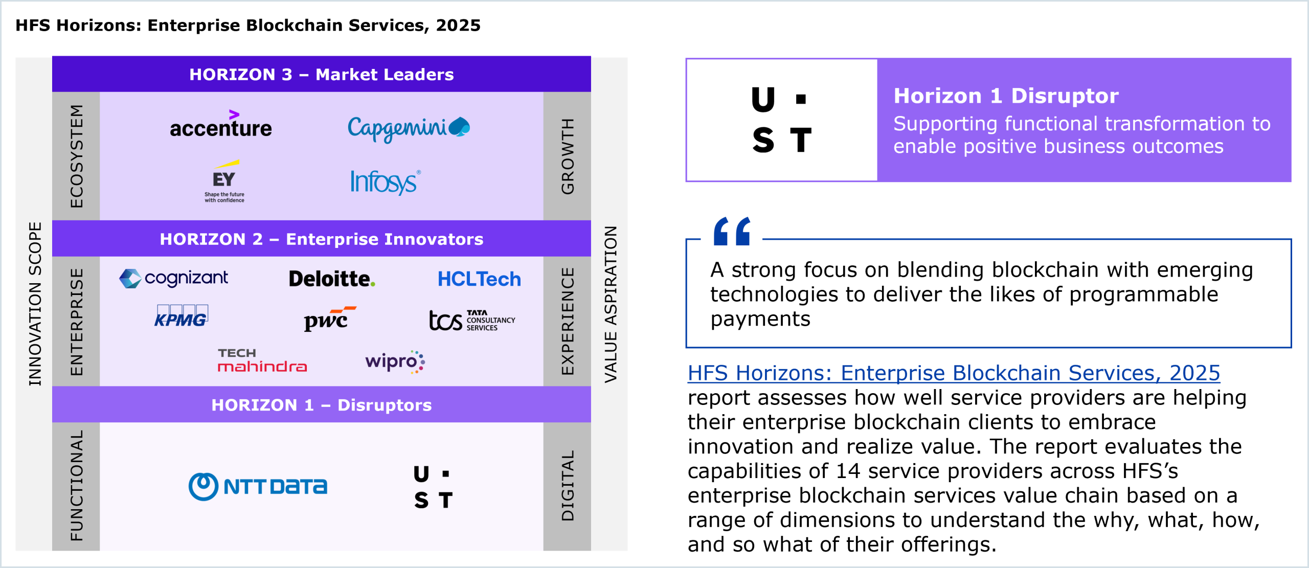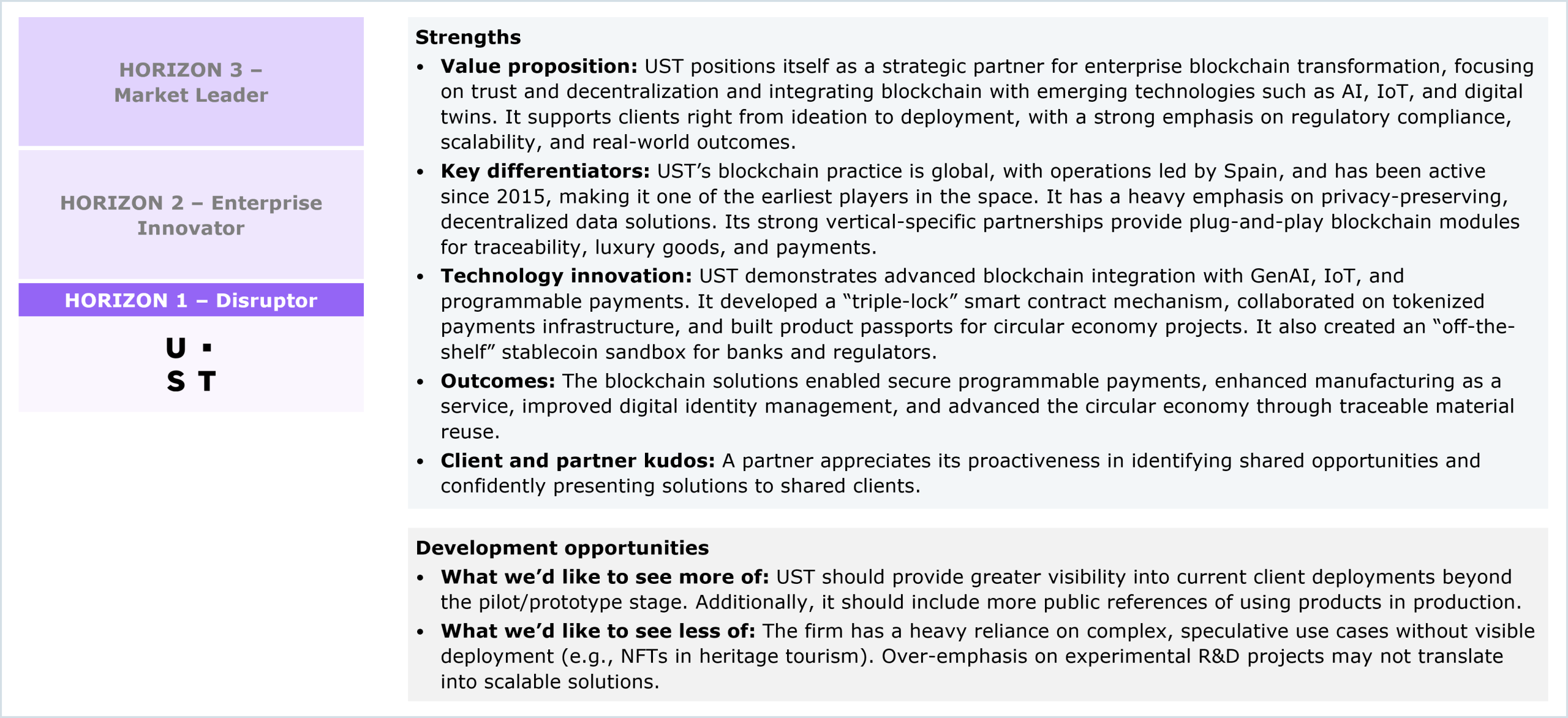 UST’s performance in the study and HFS’ views of its strengths and development opportunities for enterprise blockchain service capabilities