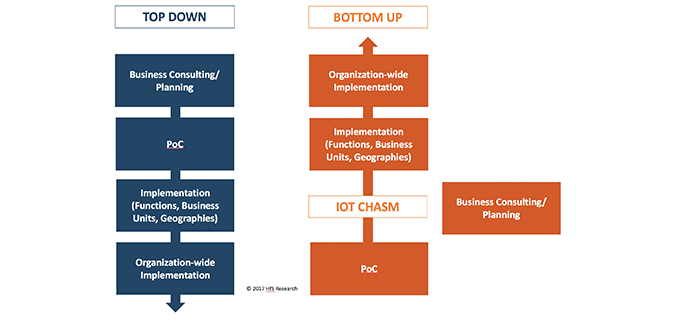 HfS Research Perspective – There are differences between the bottom- up and the top-down approach. In IoT, a top-down approach is working better than a bottom-up approach for long term results/adoption. In the bottom-up approach, service providers reach out to their large $100 M+ clients and propose PoCs for $200K- $300K which buyers have no problem in approving from their operating budget. Service providers get marquee customer logo and their sales and delivery people get good appraisals. But after the PoC, service providers often hit the IoT chasm as large scale implementation requires a bigger budget and approval from different stakeholders. This is shown in the Exhibit below. Crossing this chasm will require serious consulting and senior stakeholder engagement which sometimes is above few service providers pay grade. In the top-down approach, service providers start with consulting and after senior management and stakeholder’s buy in, start PoCs. Once PoCs start delivering the results, scaling up is not difficult.